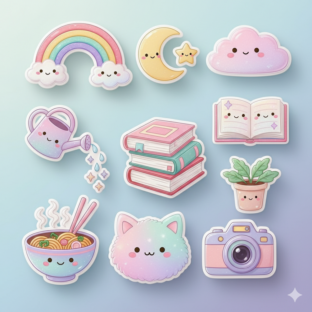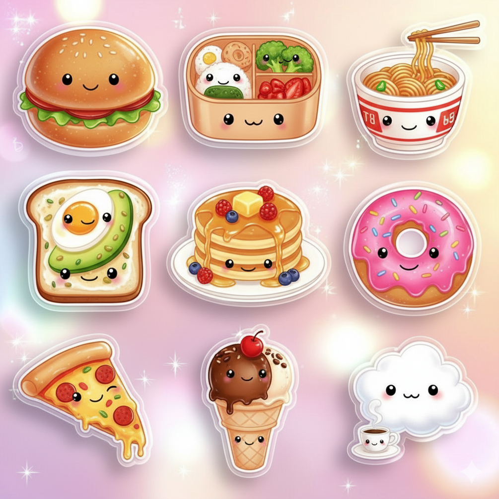This cute collection includes everything from cozy rainbows, moons, clouds, plants, and books to yummy treats like burgers, donuts, pizza, noodles, and ice cream — all with charming kawaii faces and soft pastel colors.