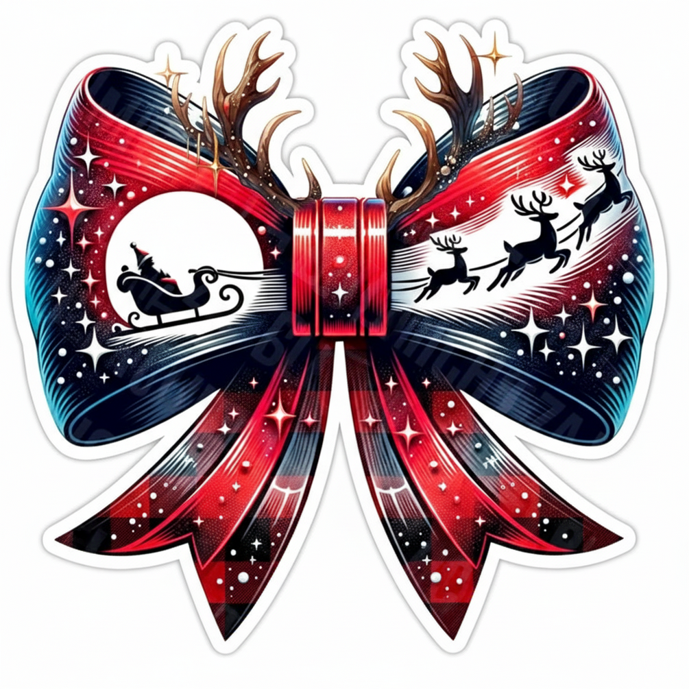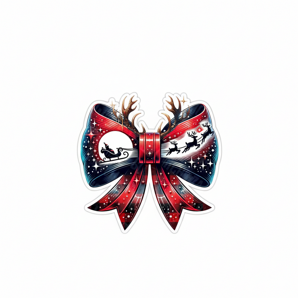 Featuring Santa and his reindeer flying across a starry sky, this elegant red-and-blue bow adds a joyful Christmas sparkle anywhere — your laptop, journal, mug, or gift wrap.